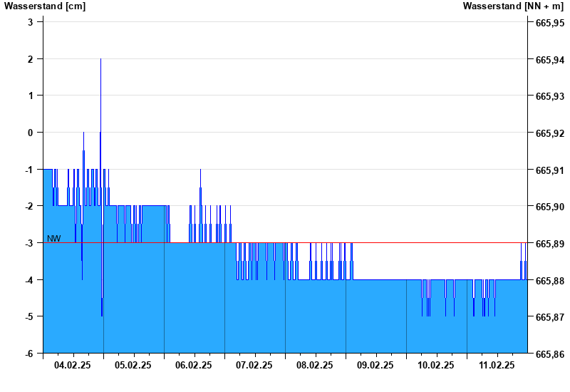 Messwerte beeinflusst durch Kraftwerkssteuerung und Kiesumlagerungen. Kiesanlandungen können bei Niedrigwasser Trockenlegung der Messinstrumente bewirken.