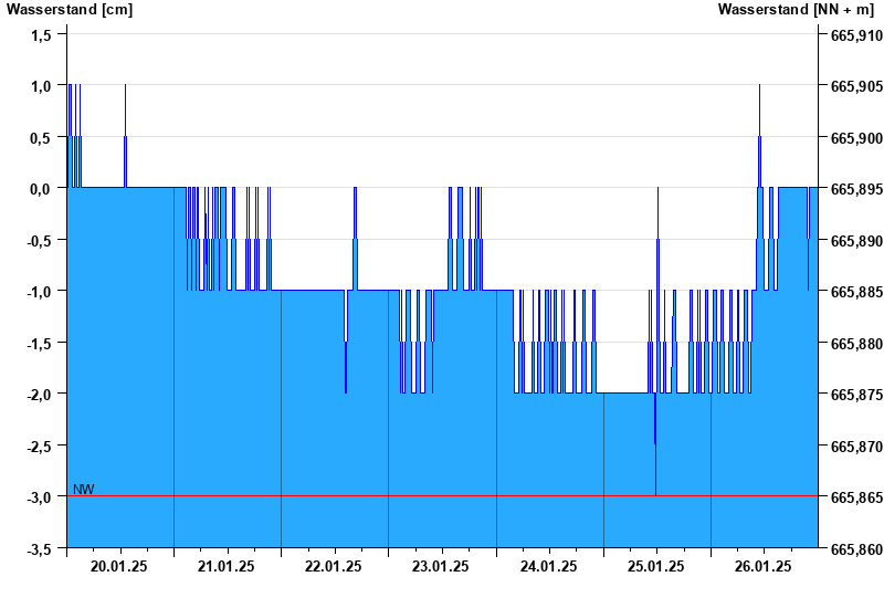 Messwerte beeinflusst durch Kraftwerkssteuerung und Kiesumlagerungen. Kiesanlandungen können bei Niedrigwasser Trockenlegung der Messinstrumente bewirken.