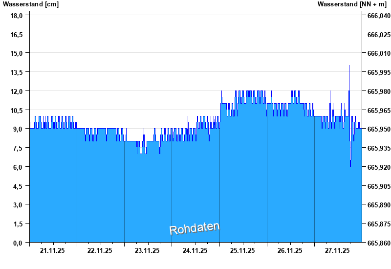Messwerte beeinflusst durch Kraftwerkssteuerung und Kiesumlagerungen. Kiesanlandungen können bei Niedrigwasser Trockenlegung der Messinstrumente bewirken.