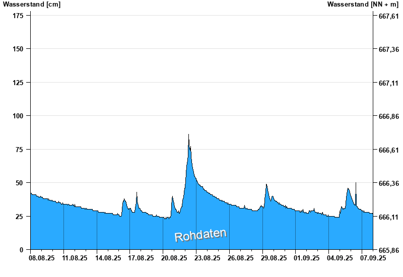 Messwerte beeinflusst durch Kraftwerkssteuerung und Kiesumlagerungen. Kiesanlandungen können bei Niedrigwasser Trockenlegung der Messinstrumente bewirken.