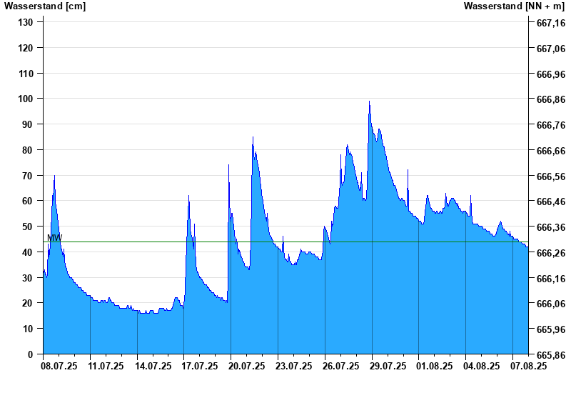 Messwerte beeinflusst durch Kraftwerkssteuerung und Kiesumlagerungen. Kiesanlandungen können bei Niedrigwasser Trockenlegung der Messinstrumente bewirken.
