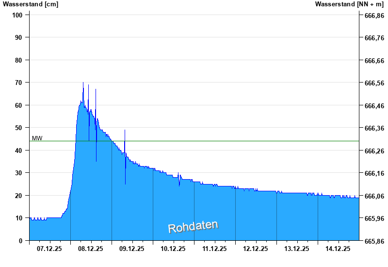Messwerte beeinflusst durch Kraftwerkssteuerung und Kiesumlagerungen. Kiesanlandungen können bei Niedrigwasser Trockenlegung der Messinstrumente bewirken.