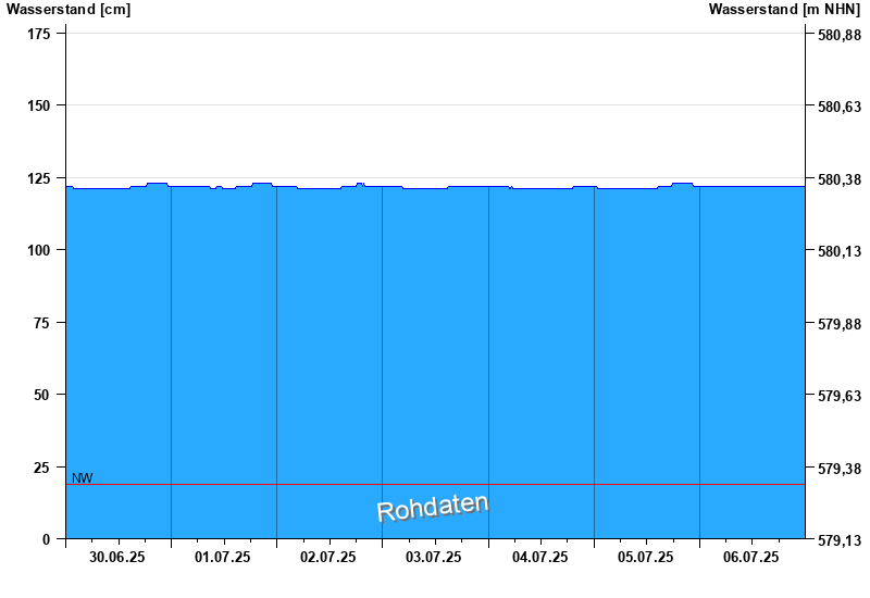 Der Pegel wird durch Baumaßnahmen unterhalb beeinflusst (Rückstau). Entsprechend sind die Abflusswerte nicht korrekt