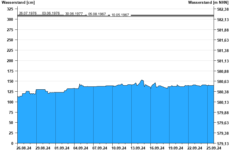 Der Pegel wird durch Baumaßnahmen unterhalb beeinflusst (Rückstau). Entsprechend sind die Abflusswerte nicht korrekt