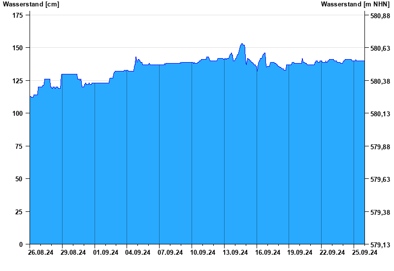 Der Pegel wird durch Baumaßnahmen unterhalb beeinflusst (Rückstau). Entsprechend sind die Abflusswerte nicht korrekt