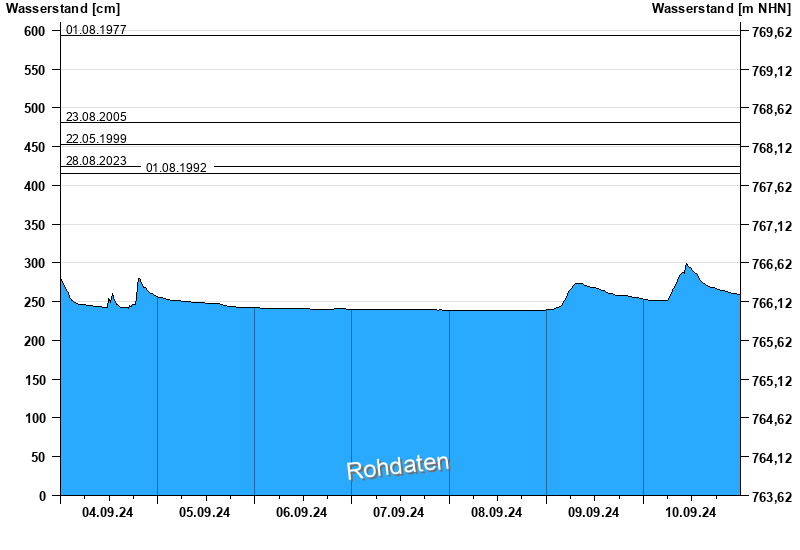 Störung wegen Stromversorgungsprobleme. Der Wasserstand wird durch starke Kiesumlagerungen beeinflusst. Der hier gezeigte Abfluss kann entsprechend stark vom tatsächlichen Abfluss abweichen.