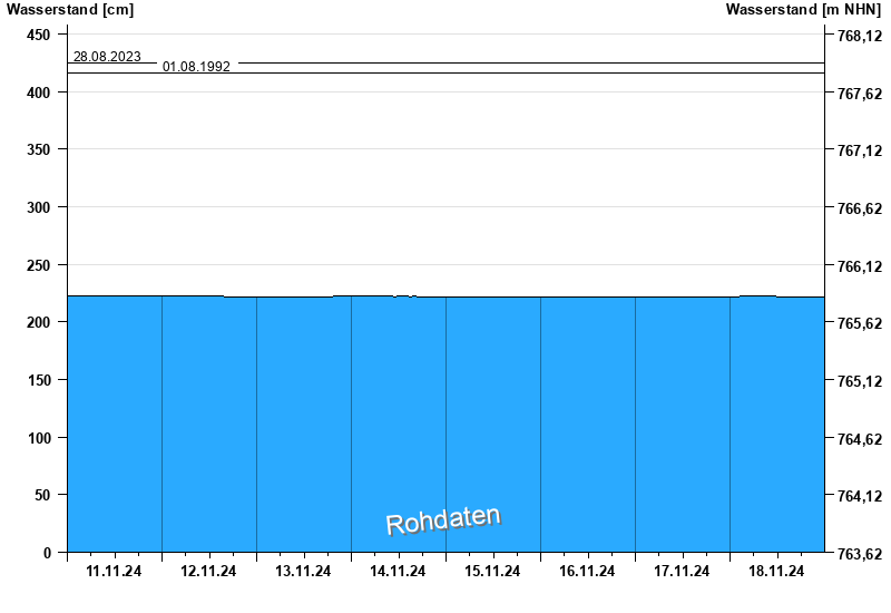 Störung wegen Stromversorgungsprobleme. Der Wasserstand wird durch starke Kiesumlagerungen beeinflusst. Der hier gezeigte Abfluss kann entsprechend stark vom tatsächlichen Abfluss abweichen.