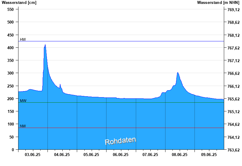 Störung wegen Stromversorgungsprobleme. Der Wasserstand wird durch starke Kiesumlagerungen beeinflusst. Der hier gezeigte Abfluss kann entsprechend stark vom tatsächlichen Abfluss abweichen.