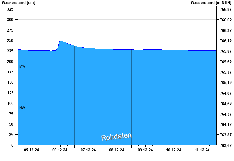 Störung wegen Stromversorgungsprobleme. Der Wasserstand wird durch starke Kiesumlagerungen beeinflusst. Der hier gezeigte Abfluss kann entsprechend stark vom tatsächlichen Abfluss abweichen.