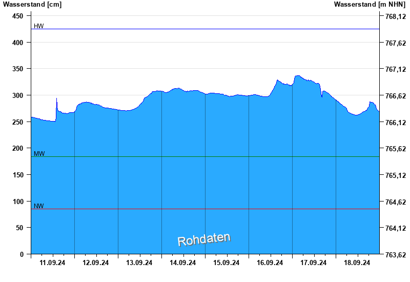 Störung wegen Stromversorgungsprobleme. Der Wasserstand wird durch starke Kiesumlagerungen beeinflusst. Der hier gezeigte Abfluss kann entsprechend stark vom tatsächlichen Abfluss abweichen.