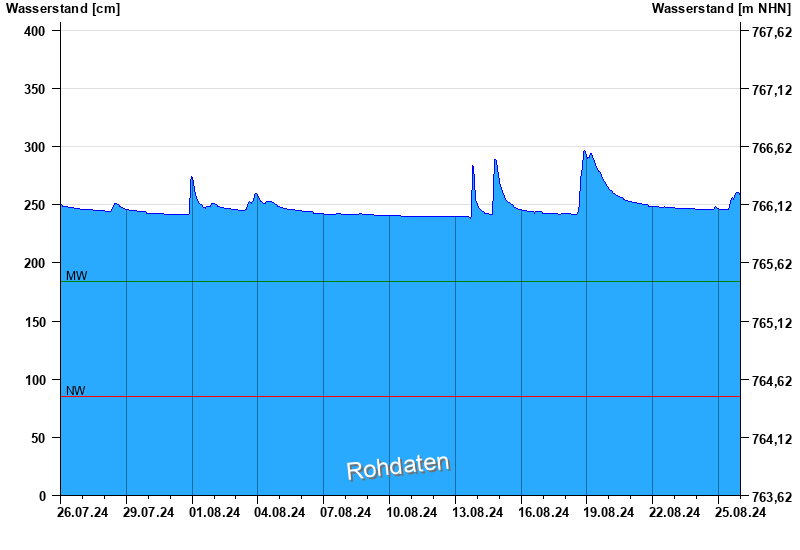 Störung wegen Stromversorgungsprobleme. Der Wasserstand wird durch starke Kiesumlagerungen beeinflusst. Der hier gezeigte Abfluss kann entsprechend stark vom tatsächlichen Abfluss abweichen.