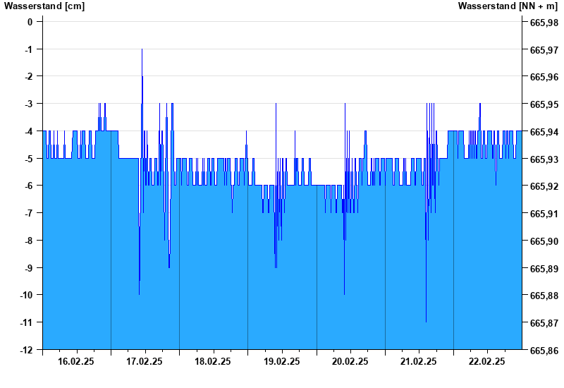 Messwerte beeinflusst durch Kraftwerkssteuerung und Kiesumlagerungen. Kiesanlandungen können bei Niedrigwasser Trockenlegung der Messinstrumente bewirken.