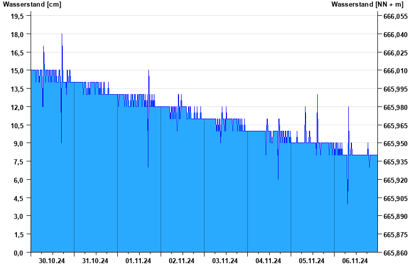Messwerte beeinflusst durch Kraftwerkssteuerung und Kiesumlagerungen. Kiesanlandungen können bei Niedrigwasser Trockenlegung der Messinstrumente bewirken.