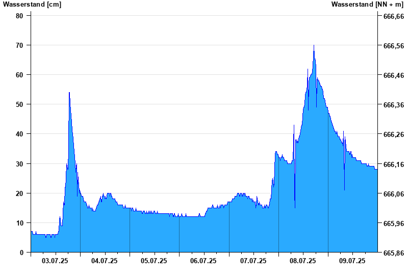 Messwerte beeinflusst durch Kraftwerkssteuerung und Kiesumlagerungen. Kiesanlandungen können bei Niedrigwasser Trockenlegung der Messinstrumente bewirken.