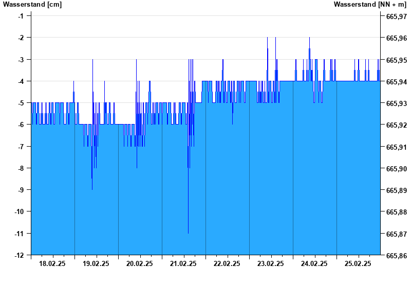 Messwerte beeinflusst durch Kraftwerkssteuerung und Kiesumlagerungen. Kiesanlandungen können bei Niedrigwasser Trockenlegung der Messinstrumente bewirken.