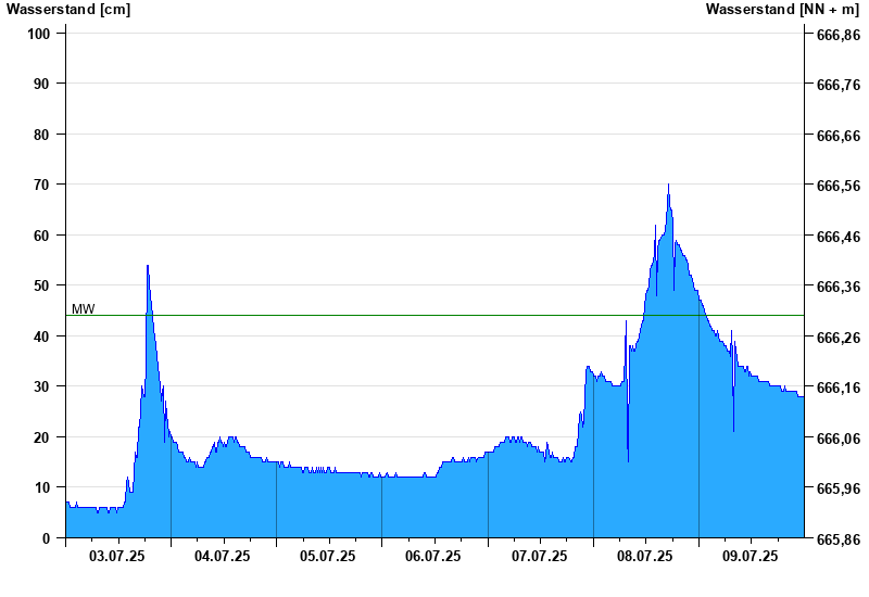 Messwerte beeinflusst durch Kraftwerkssteuerung und Kiesumlagerungen. Kiesanlandungen können bei Niedrigwasser Trockenlegung der Messinstrumente bewirken.
