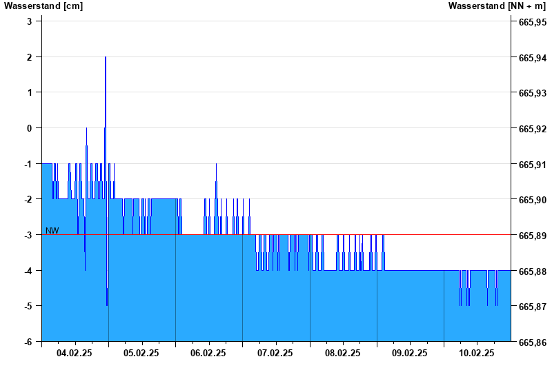 Messwerte beeinflusst durch Kraftwerkssteuerung und Kiesumlagerungen. Kiesanlandungen können bei Niedrigwasser Trockenlegung der Messinstrumente bewirken.