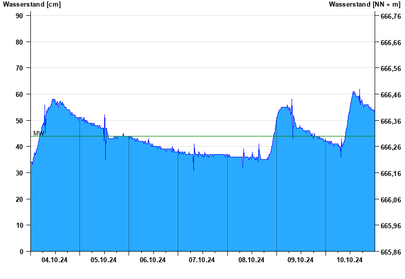 Messwerte beeinflusst durch Kraftwerkssteuerung und Kiesumlagerungen. Kiesanlandungen können bei Niedrigwasser Trockenlegung der Messinstrumente bewirken.