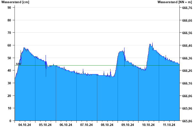 Messwerte beeinflusst durch Kraftwerkssteuerung und Kiesumlagerungen. Kiesanlandungen können bei Niedrigwasser Trockenlegung der Messinstrumente bewirken.