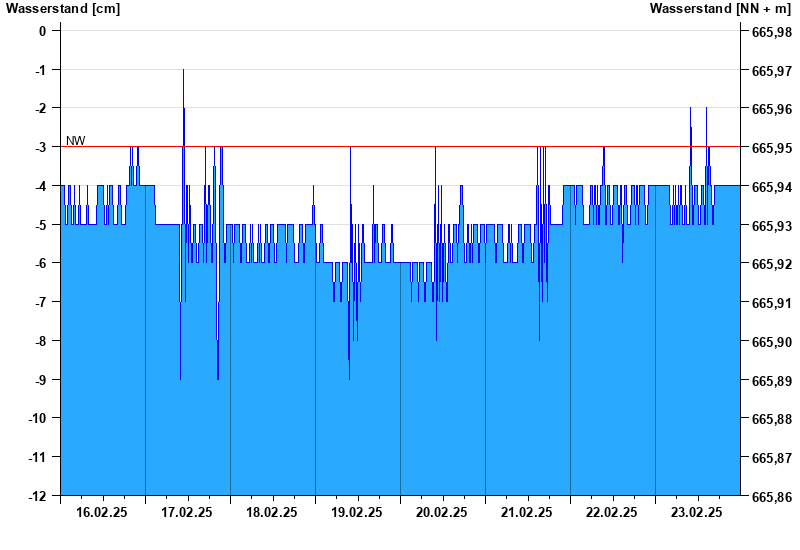 Messwerte beeinflusst durch Kraftwerkssteuerung und Kiesumlagerungen. Kiesanlandungen können bei Niedrigwasser Trockenlegung der Messinstrumente bewirken.