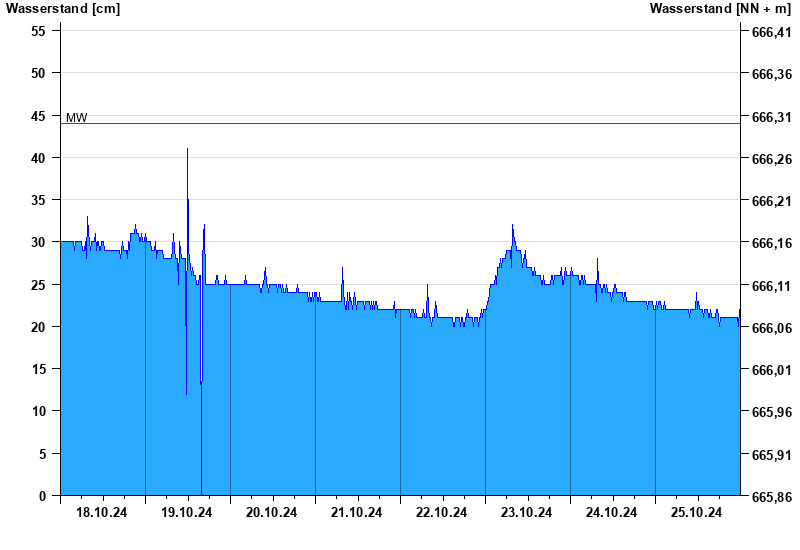 Messwerte beeinflusst durch Kraftwerkssteuerung und Kiesumlagerungen. Kiesanlandungen können bei Niedrigwasser Trockenlegung der Messinstrumente bewirken.