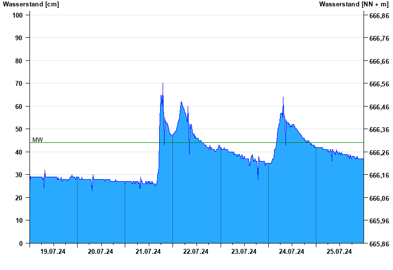 Messwerte beeinflusst durch Kraftwerkssteuerung und Kiesumlagerungen. Kiesanlandungen können bei Niedrigwasser Trockenlegung der Messinstrumente bewirken.