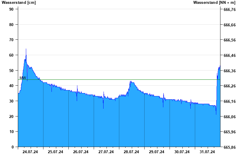 Messwerte beeinflusst durch Kraftwerkssteuerung und Kiesumlagerungen. Kiesanlandungen können bei Niedrigwasser Trockenlegung der Messinstrumente bewirken.