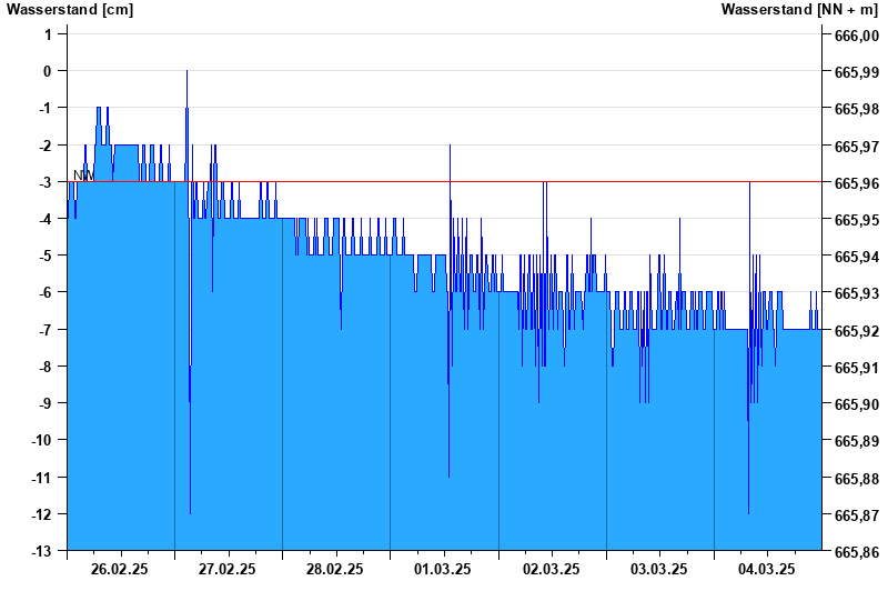 Messwerte beeinflusst durch Kraftwerkssteuerung und Kiesumlagerungen. Kiesanlandungen können bei Niedrigwasser Trockenlegung der Messinstrumente bewirken.