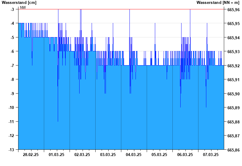 Messwerte beeinflusst durch Kraftwerkssteuerung und Kiesumlagerungen. Kiesanlandungen können bei Niedrigwasser Trockenlegung der Messinstrumente bewirken.