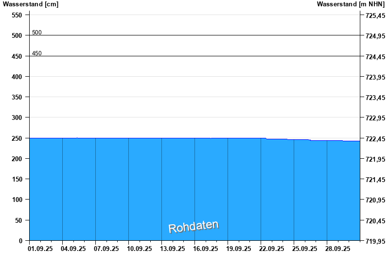 - 450 cm: B 307: Straßenbrücke unterhalb des Sylvensteinspeichers überflutet.