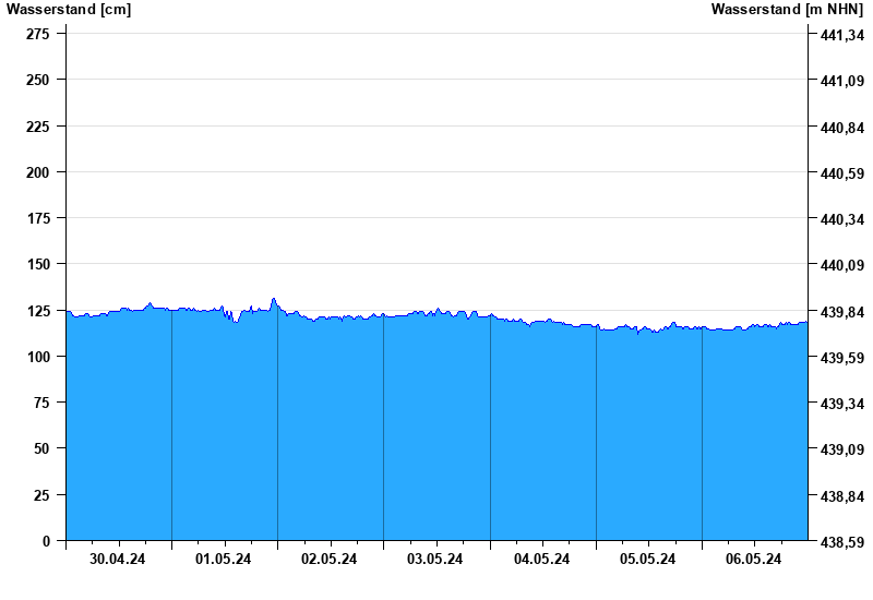 - 320 cm: Günzburg: Beginn der Ausleitung im Bereich der Staustufe Dillingen (750 m3/s) in den Riedstrom. Die Ausleitung ist abhängig vom Zulauf von Mindel und Brenz