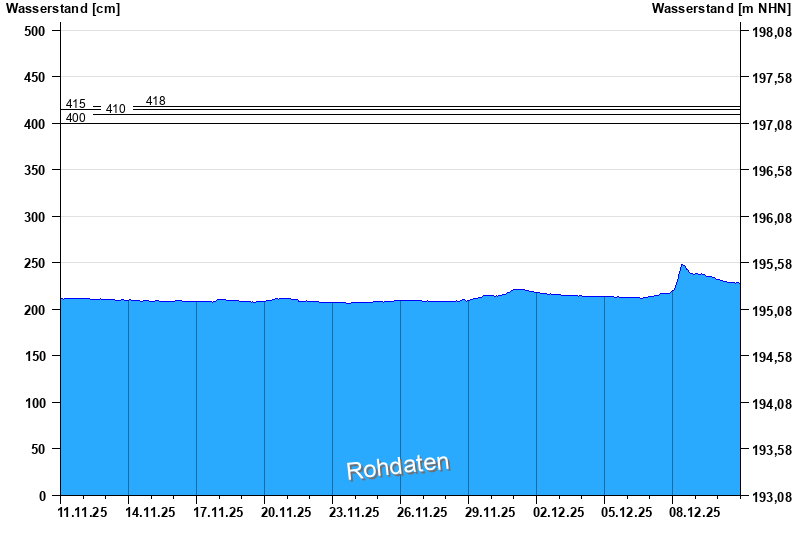 - 400 cm: Mittelsinn: Zufahrt zum Pegel überflutet.
