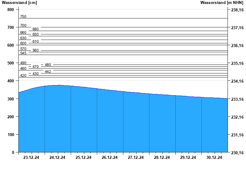 - 545 cm: Bamberg: Durch Rückstau Main beginnende Überflutung der Uferwege am Main-Donau-Kanal im Stadtgebiet.