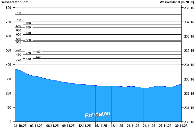 - 545 cm: Bamberg: Durch Rückstau Main beginnende Überflutung der Uferwege am Main-Donau-Kanal im Stadtgebiet.