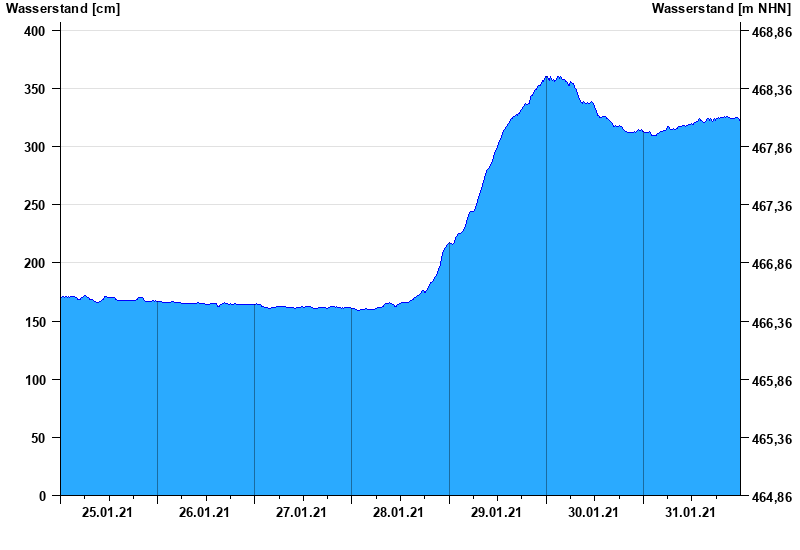 Pegel stillgelegt: Aktuelle Daten Pegel Neu-Ulm/Donau: https://www.hnd.bayern.de/pegel/donau_bis_kelheim/neu-ulm-10026293 Pegel durch außerordentlichen Kraftwerksbetrieb beeinflusst.