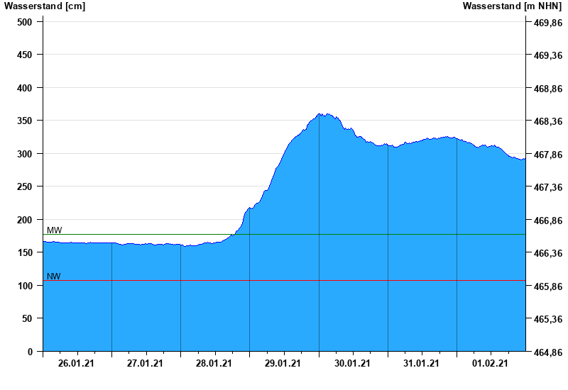 Pegel stillgelegt: Aktuelle Daten Pegel Neu-Ulm/Donau: https://www.hnd.bayern.de/pegel/donau_bis_kelheim/neu-ulm-10026293 Pegel durch außerordentlichen Kraftwerksbetrieb beeinflusst.